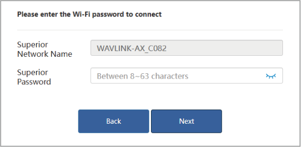 - Enter the WiFi password of the host router and click Next.