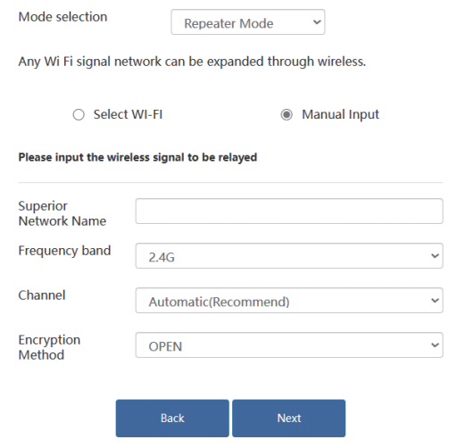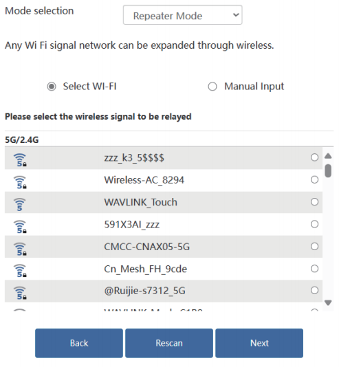 - If the SSID of the host router is hidden, please try to select manual input and enter the SSID of the host router manually.