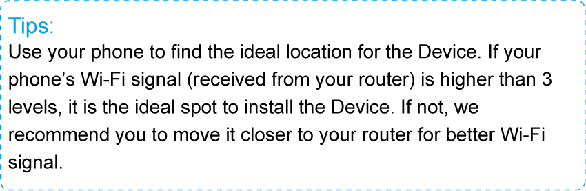- Plug the Device into an electrical outlet between your router (Host Wi-Fi) and the Wi-Fi dead zone. The location you choose must be within the range of your existing host Wi-Fi.
