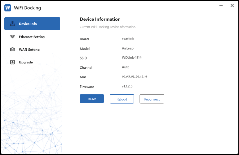Step 2: Get detailed information from the Device Info, as needed, you can click Reset to reconfigure the settings, and click Reboot to restart the APP, Mac shows the Mac address of the docking station.