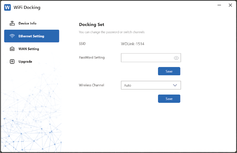 Step 3: Select your Wireless Channel and set Password in Ethernet Setting. You also can choose different wireless channels to reduce wireless signal interference. After that, click Save.