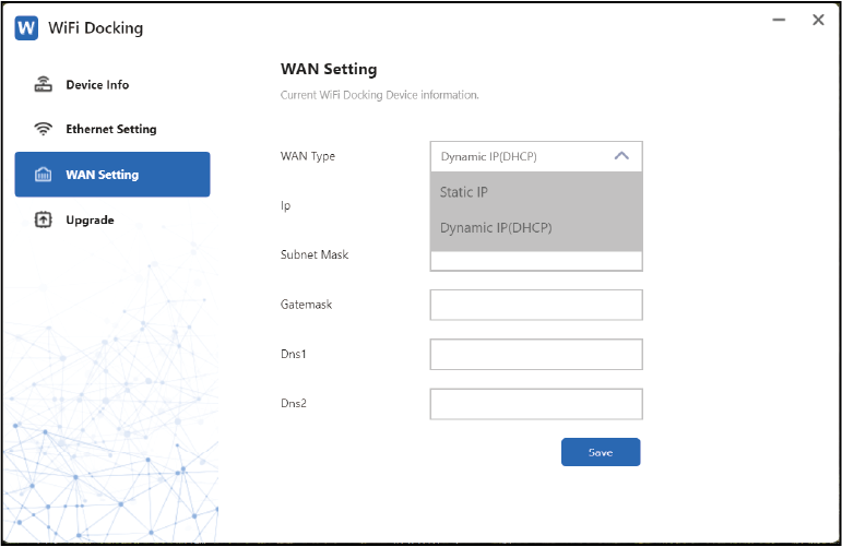 Step 4: Select WAN Setting; the default is Dynamic IP(DHCP). If you select Static IP, please enter content in the following blanks. It assigns fixed IP address for the computer automatically. It is designed for network connections, servers, remote access, etc., which require long-term stability to ensure the stability of network connections. If the ISP has provided a specified IP parameters including IP address, Subnet Mask, Gateway, DNS1 and DNS2, select Static IP from the list and enter the information provided by the ISP. After that, click Save.