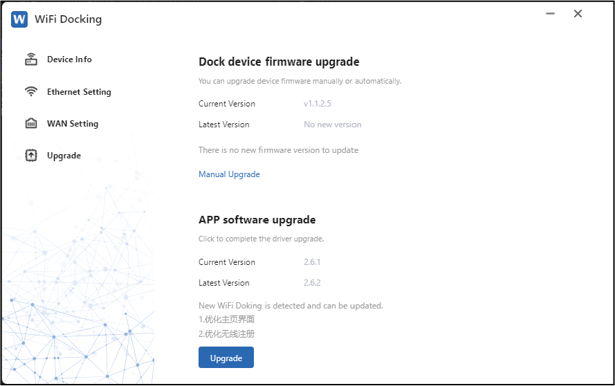 Step 5: If necessary, select Upgrade to check if the APP is up to date. If not, please manually upgrade according to the steps in the Upgrade of Quick Start Guide.