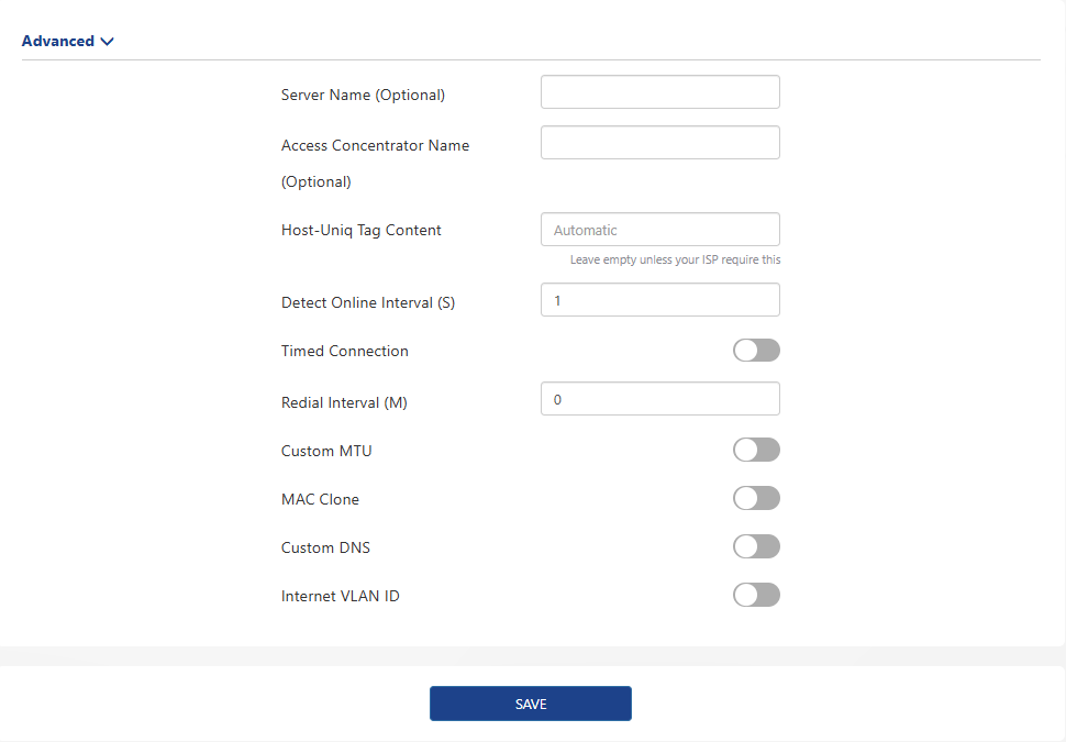 3 . In Advanced, open and configure Custom MTU, MAC Clone, Internet VLAN ID and others as your requirements.