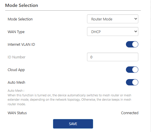 - Auto Mesh: If it is enabled, the device will automatically switch to Mesh Router Mode or Mesh Extender Mode depending on the network topology; If it is diabled, the device will keep Mesh Router Mode.
