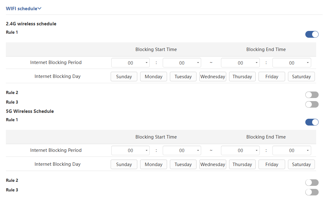 Click on Rule 1/2/3 under either the 2.4G wireless schedule or 5G Wireless Schedule to set the timing rules.