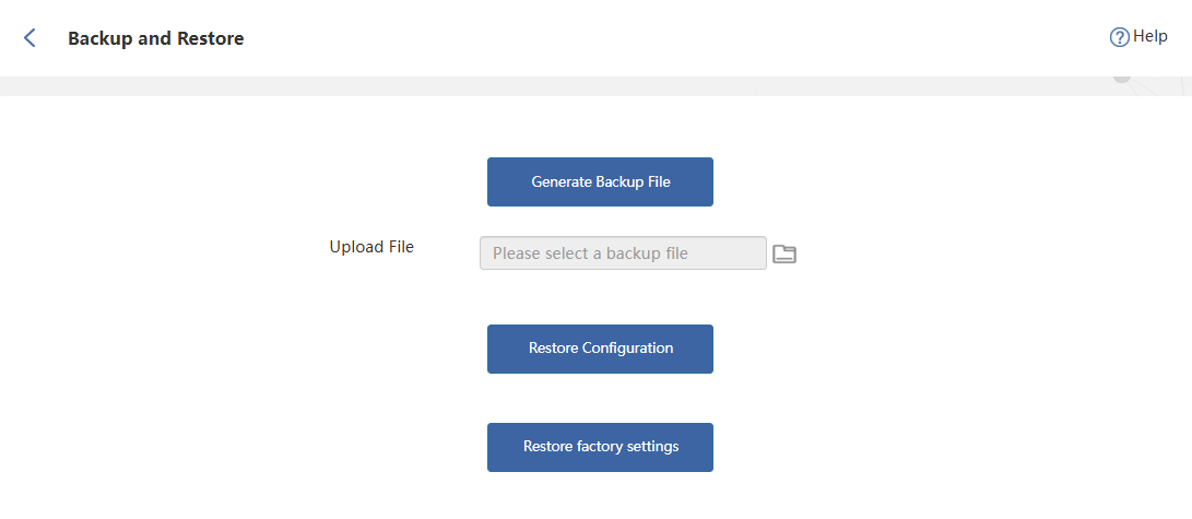 If you accidentally forget previous settings after modifying certain configuration options, you may upload a previously saved backup file to the system and click Restore Configuration to revert to earlier settings. Please note that this operation will overwrite all current configuration settings, so carefully consider before proceeding.