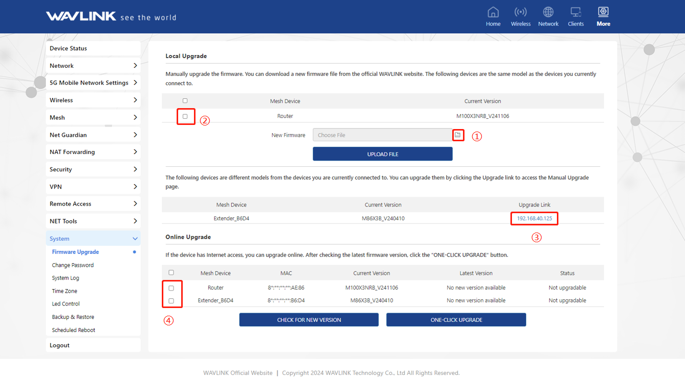 - Log in to http://wavlogin.link, click “More”, enter System and click “Firmware Upgrade”.