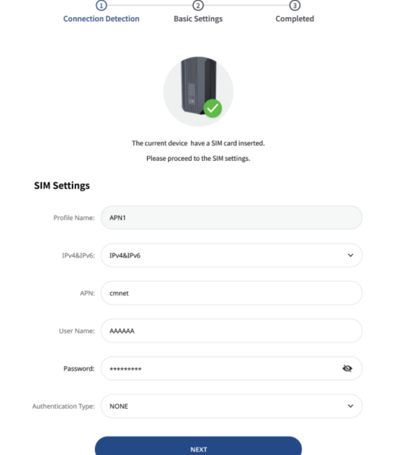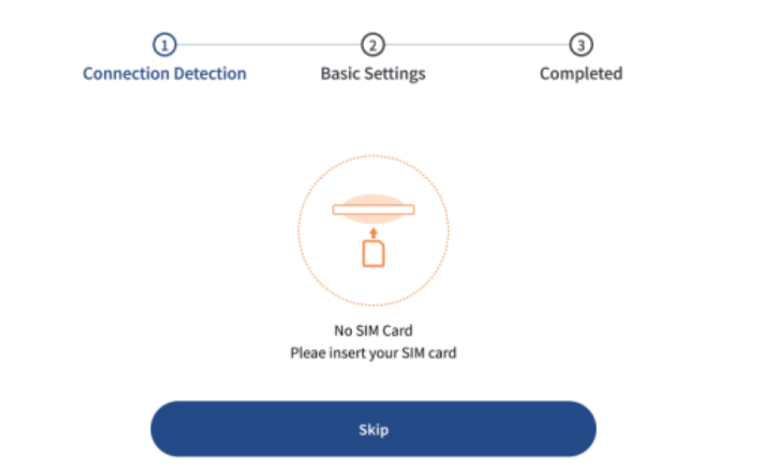 - Note: If the SIM card is not inserted, this page will appear. Click "Skip". The device automatically uses a WAN wired network. Otherwise, please insert the SIM card and refresh the page.