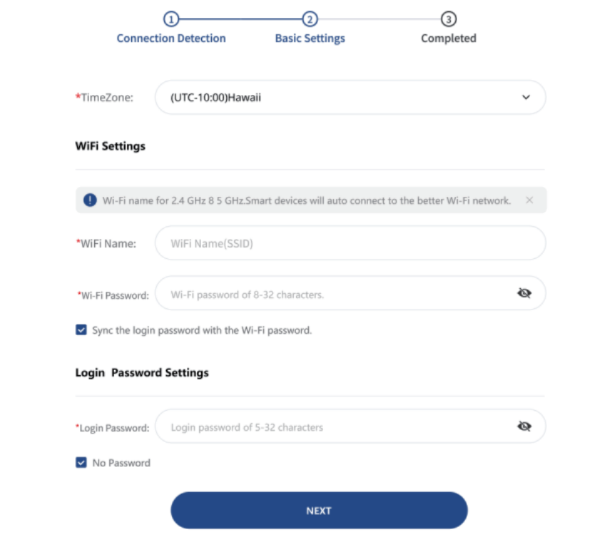 - 2.4 Enter “Basic Settings". Select “Time Zone" respectively. For your network security, please set Wi-Fi password and login password.