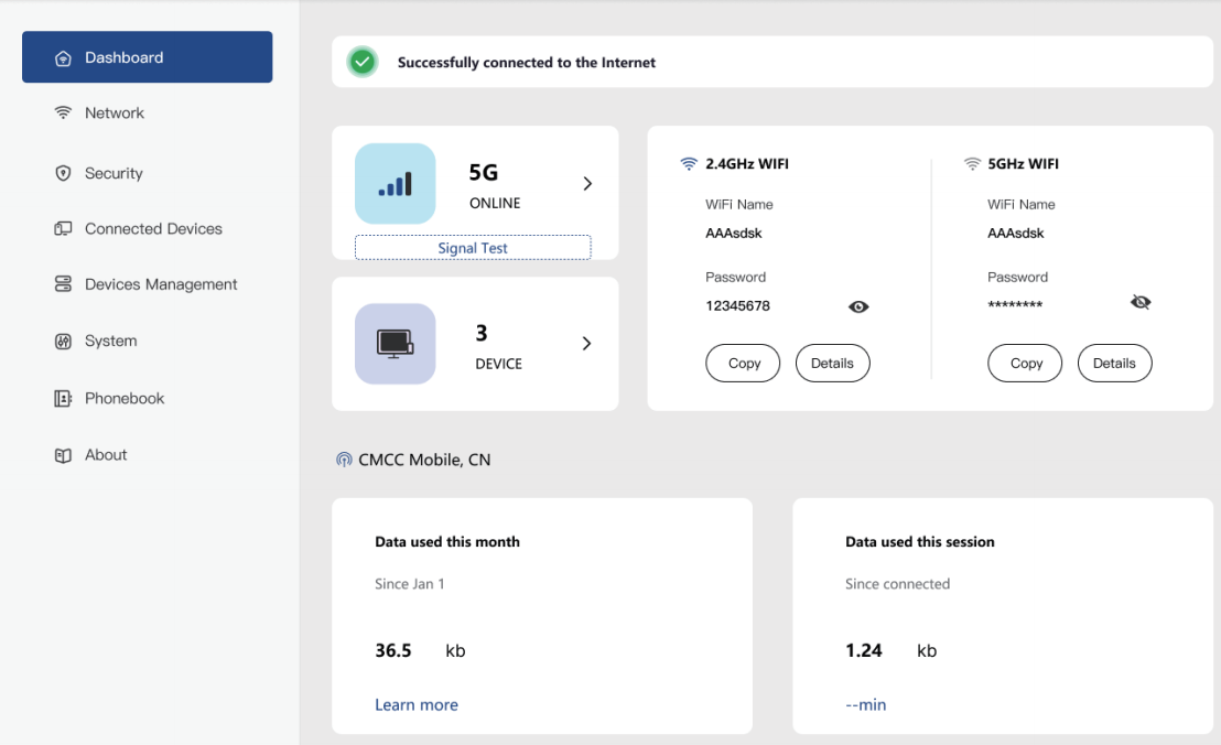 - 2.6 This is the Dashboard page, which displays basic information about the device, including the modem basic information, wireless basic information, attached end-user and traffic usages.