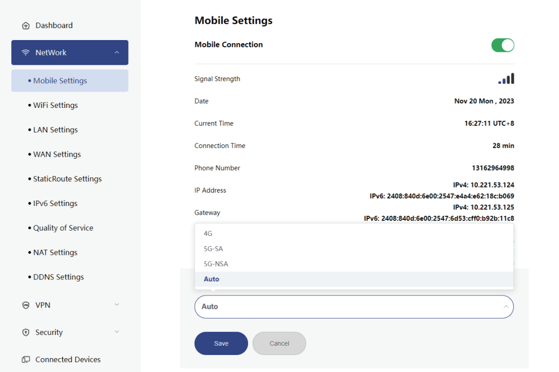 - 2.7 Click Network and select Mobile Settings to change modes. Auto is the default setting.