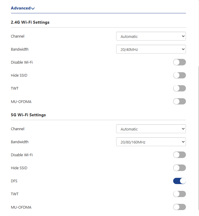 It block interference from radar systems by automatically selecting and switching to the workable channel that has not used by the radar system. It is recommended to turn on this switch to ensure compliance with local regulations and to maintain a stable and uninterrupted wireless network.