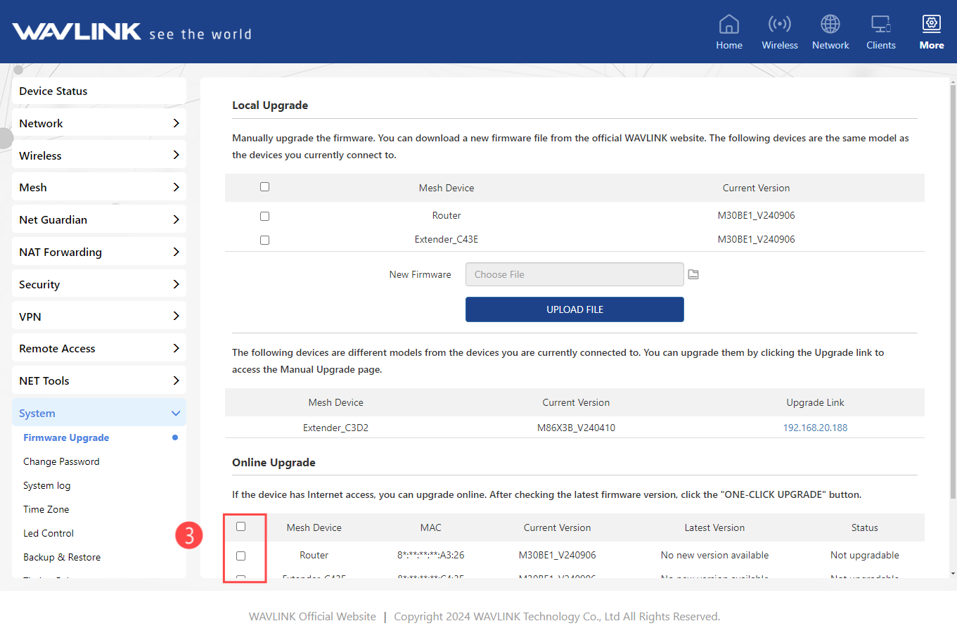 - Select the Mesh Node Name in ❸ that needs to be upgraded.