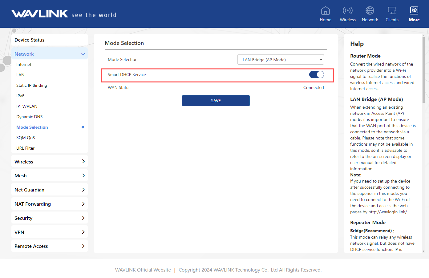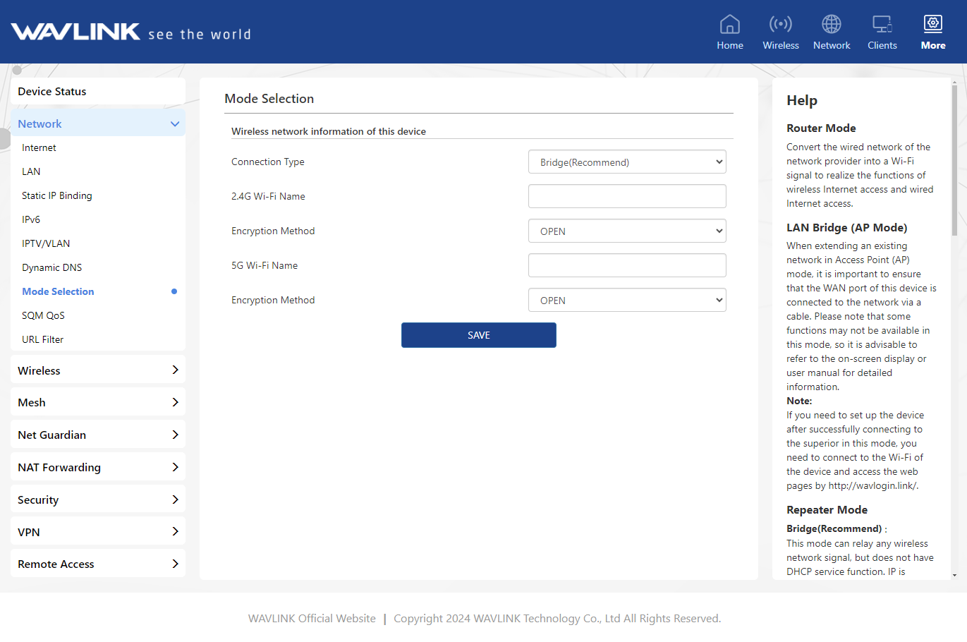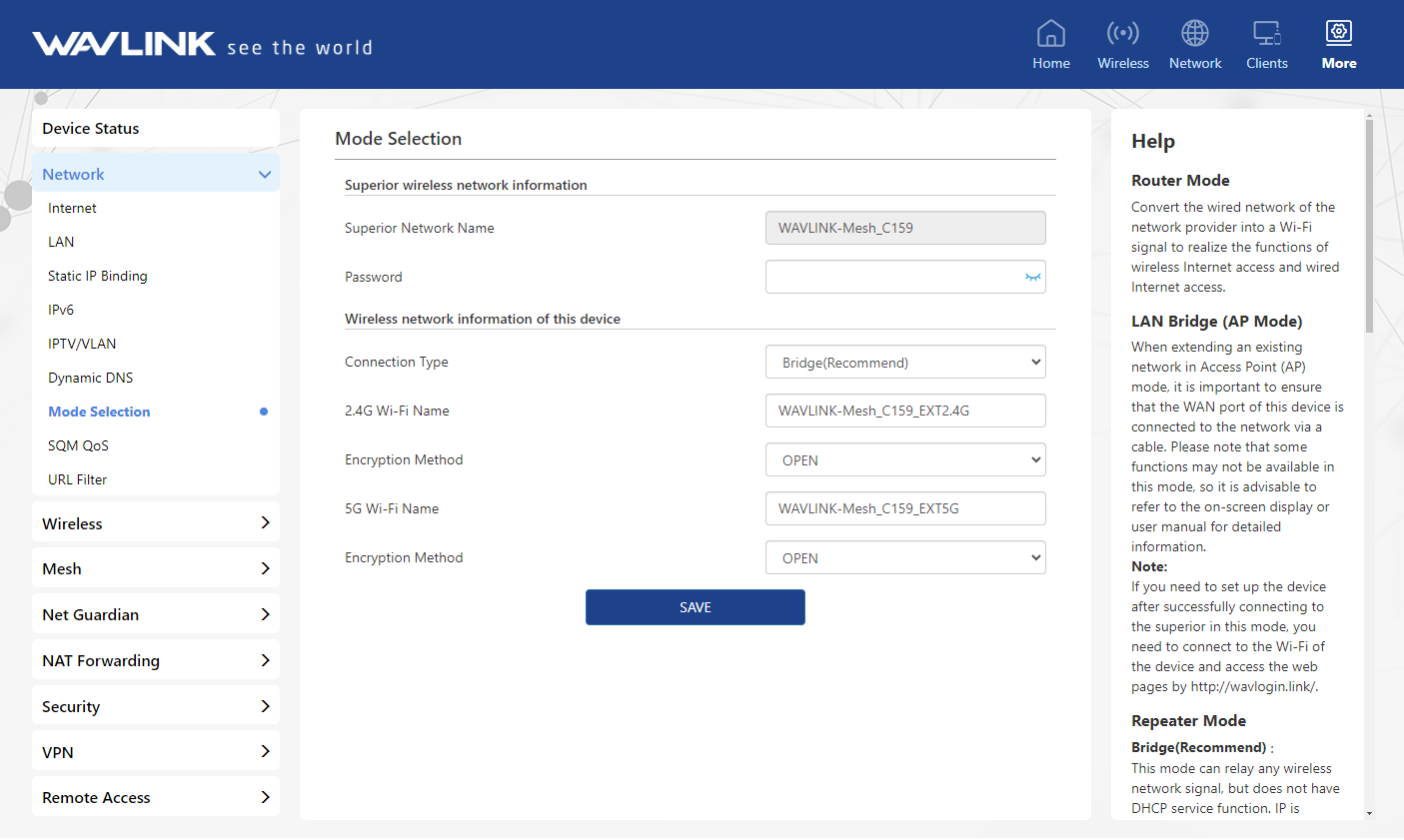 Click More>Network>Mode Selection, choose LAN Bridge(AP Mode) from the Mode Selectionlist. Then click SAVE.