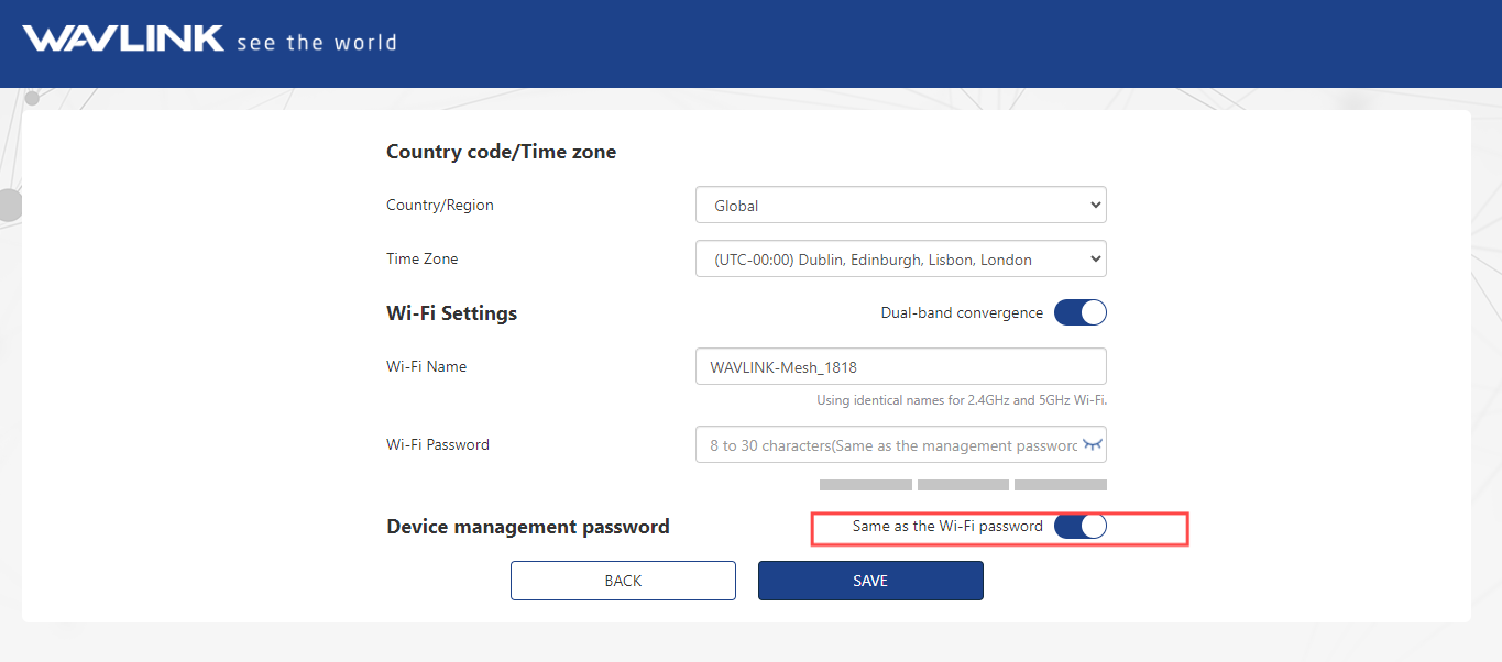 2)If it is necessary for you to set the device's administration password same as the WiFi password, choose Same as the Wi-Fi password.