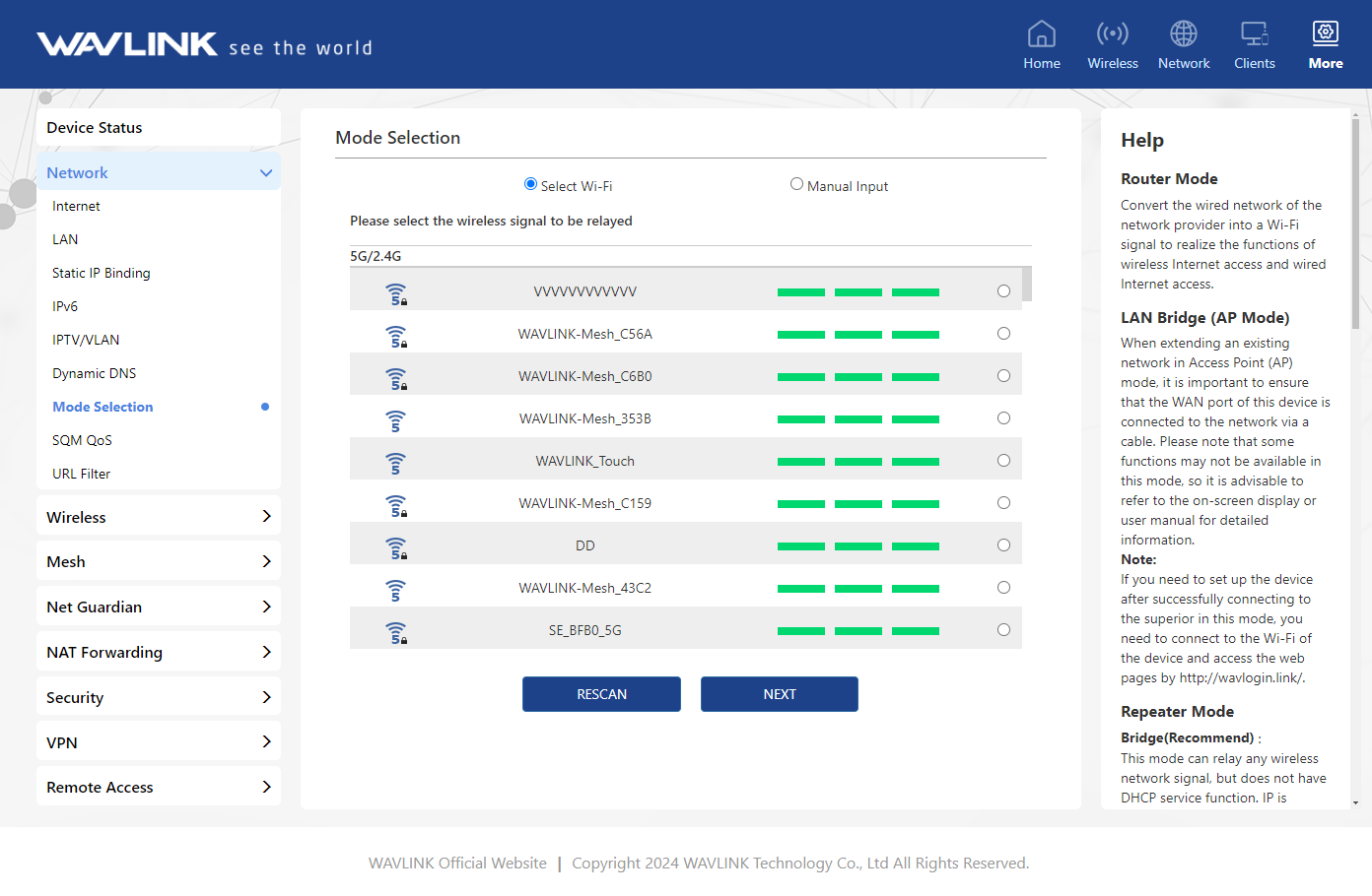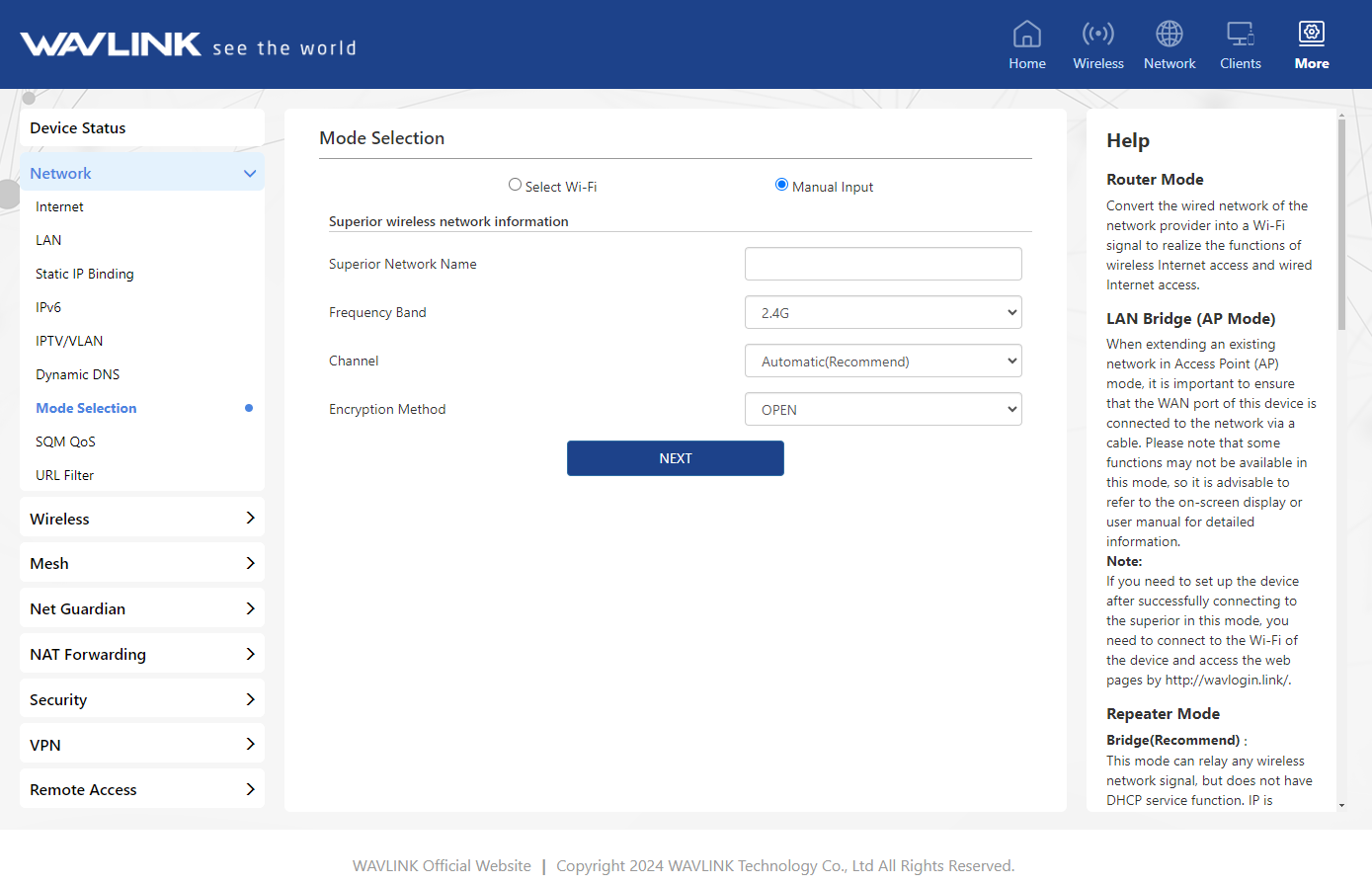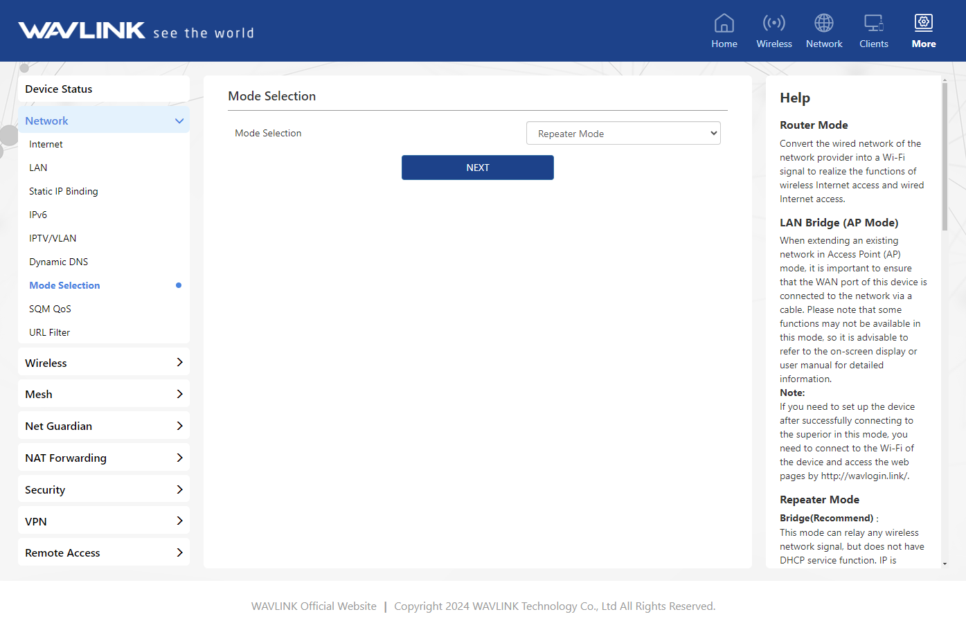 - Click More>Network>Mode Selection, choose Repeater Mode from the Mode Selection list.Then click NEXT.