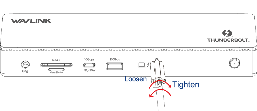 Fasten the bolt and fix the connectivity between the cable and the dock. Tighten the screw clockwise when you are assembling it. Please loosen the screw counterclockwise if you need to disassemble it.