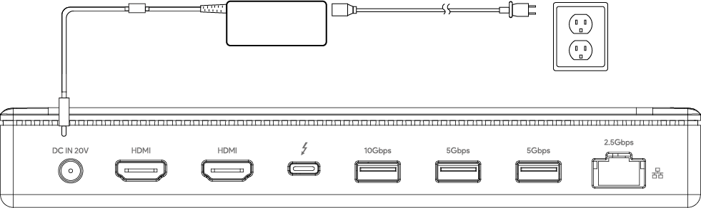 - Plug one end of the included Power Adapter into this Thunderbolt™ 4 Dock's DC IN 20V port and the other end into the power outlet.