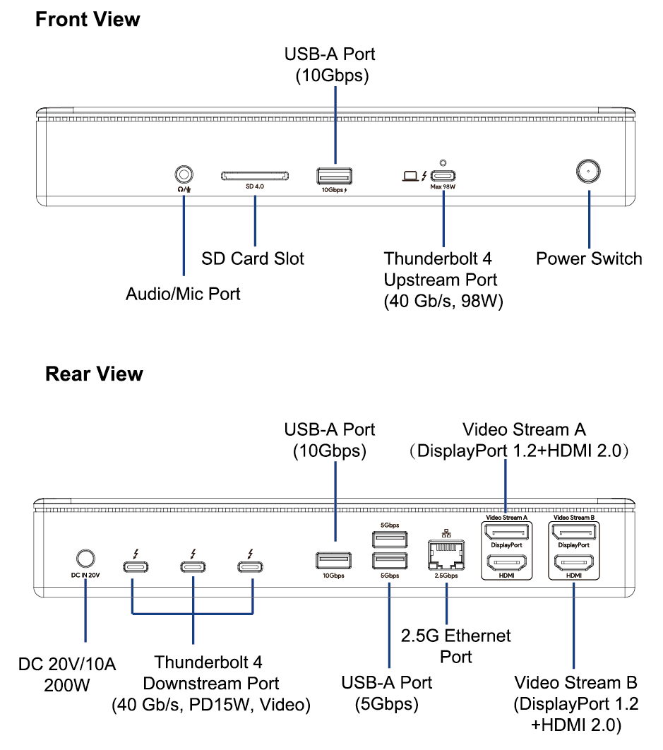 - 1×Thunderbolt™ 4 Quad Display Docking Station