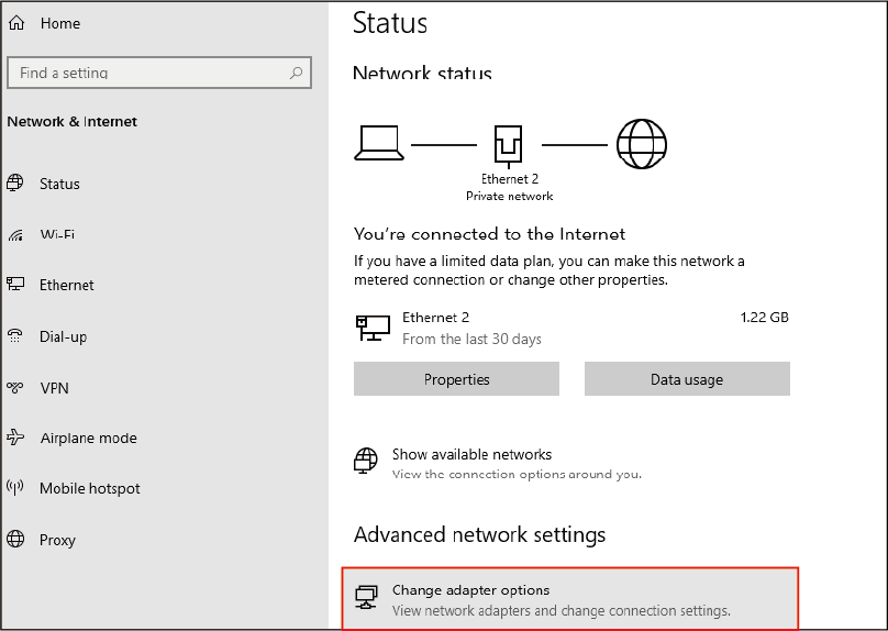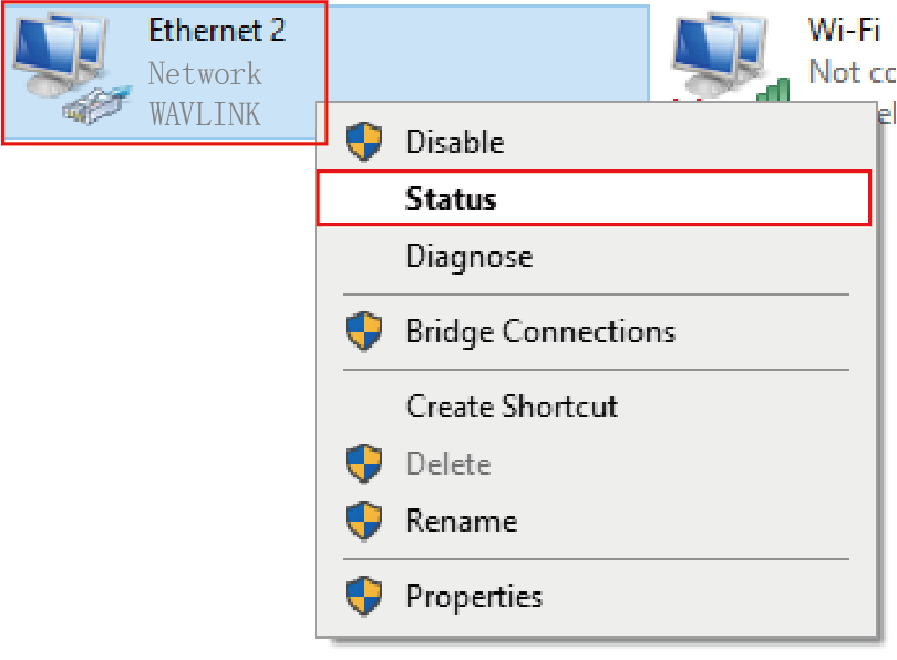 - Right-click the Ethernet icon indicating your network adapter and click Status.