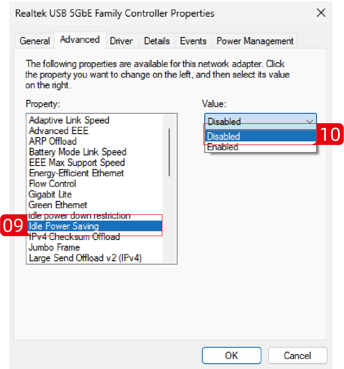 1. Disable the Idle Power Saving mode in Property.