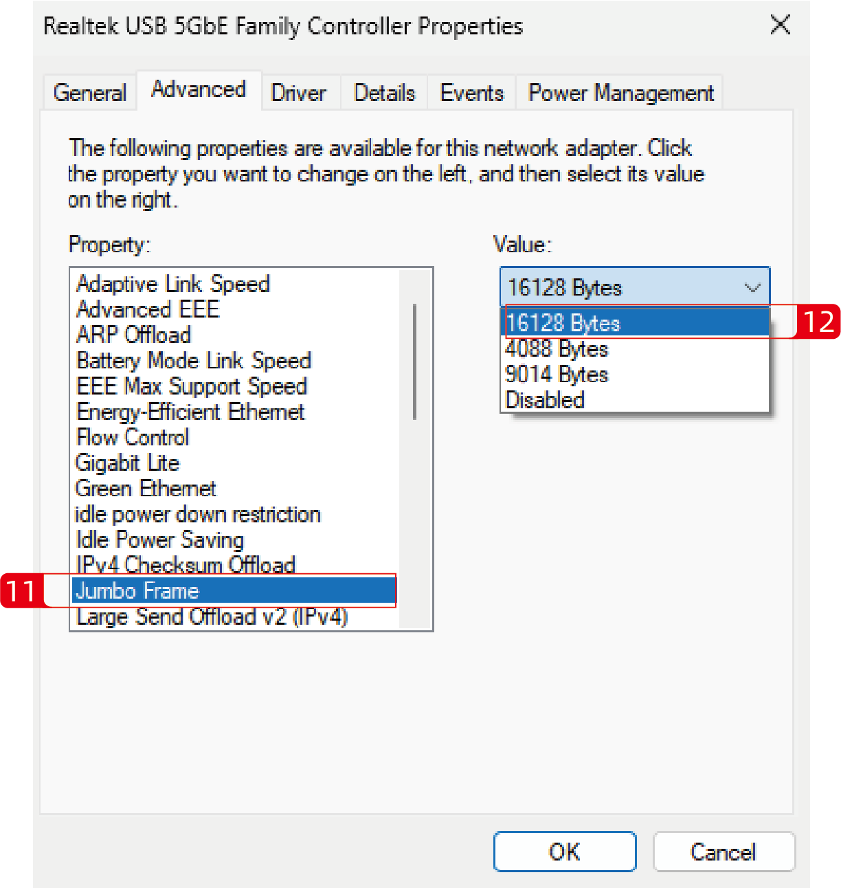 1. Set the value of Jumbo Frame to 16128 Bytes.