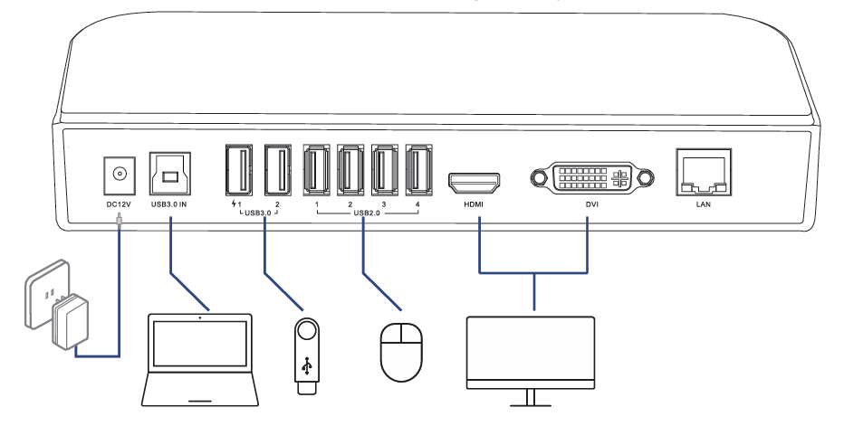 Connect the USB 3.0 IN port on the Docking Station to your laptop via the provided USB 3.0 Type-A to Type-B Cable. Please use the provided USB-A to USB-C Adapter if your computer only has a USB-C port.