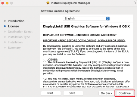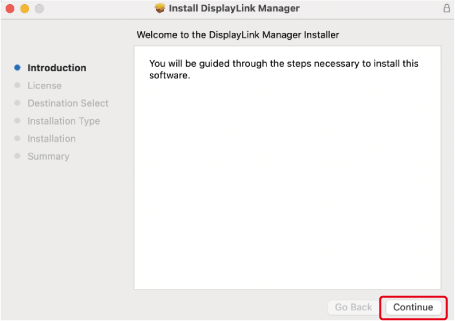 - Double-click the driver file you just downloaded, navigate to the Install DisplayLink Manager window, click Continue.