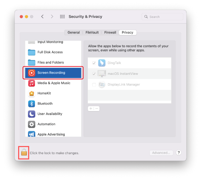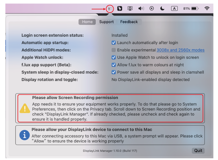 - lf you have enabled notifications from DisplayLink Manager, it will remind you to allow screen recording when it detects that this permission is missing.