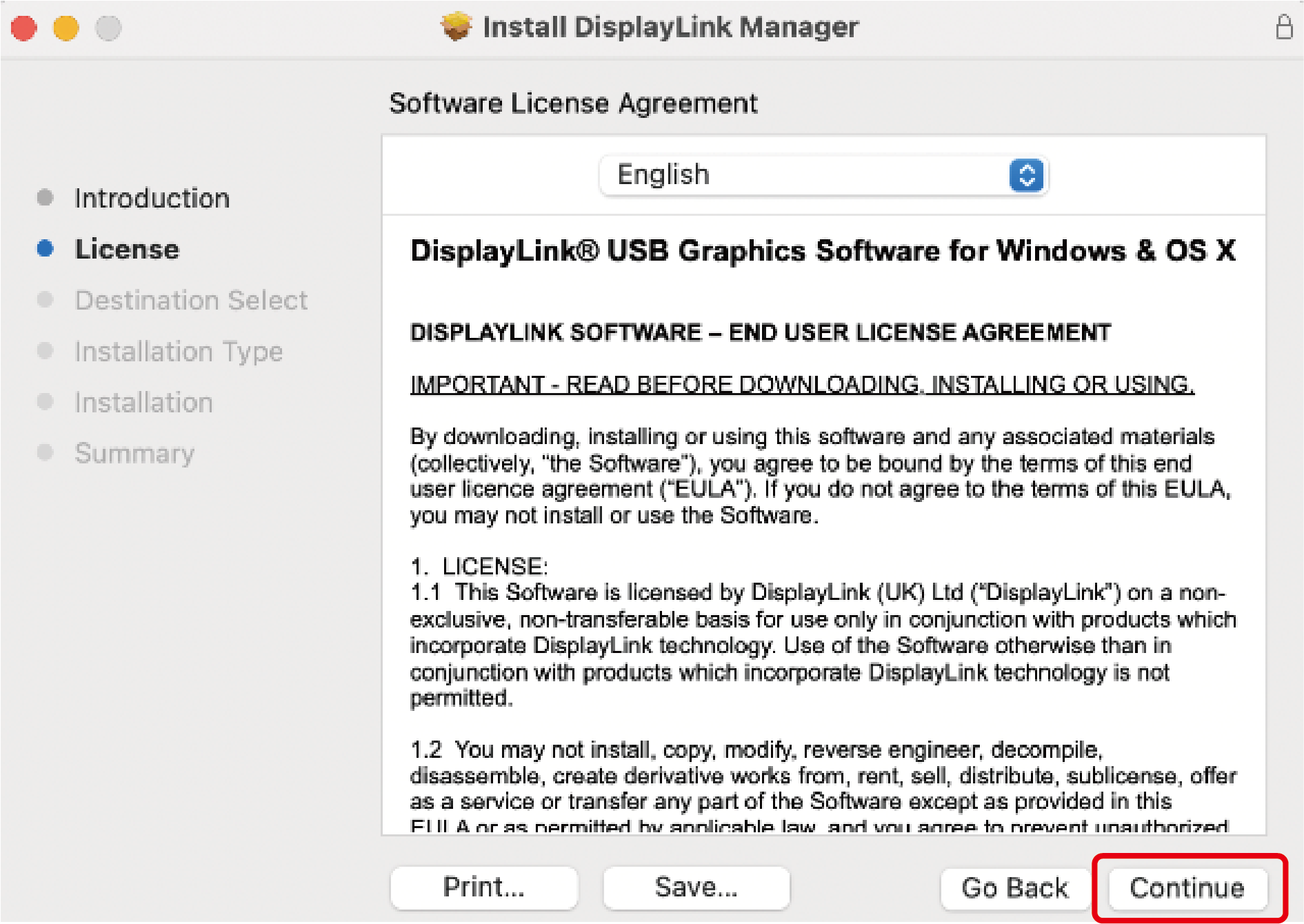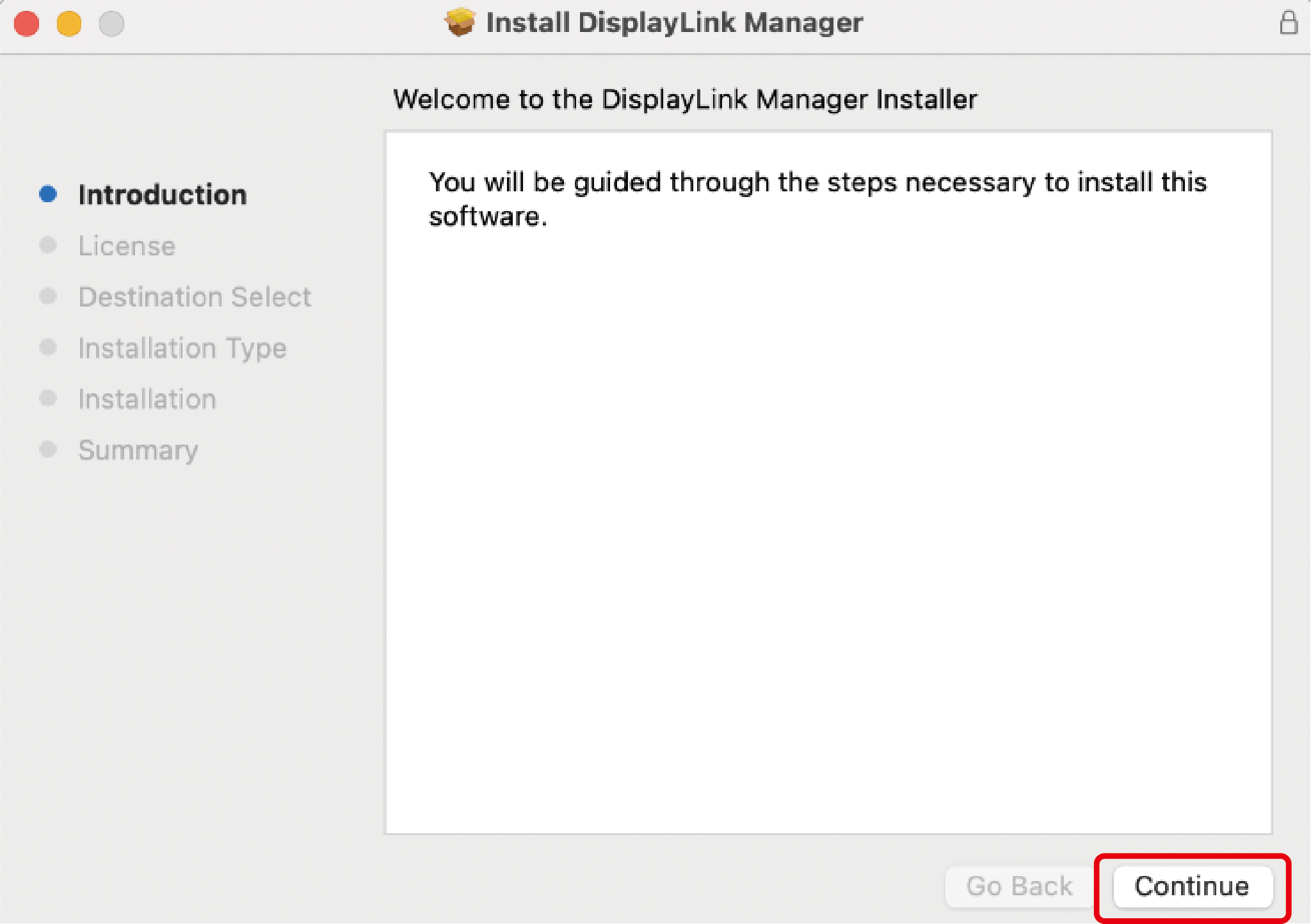 1. Double-click the driver file you just downloaded, navigate to the Install DisplayLink Manager window, click Continue.