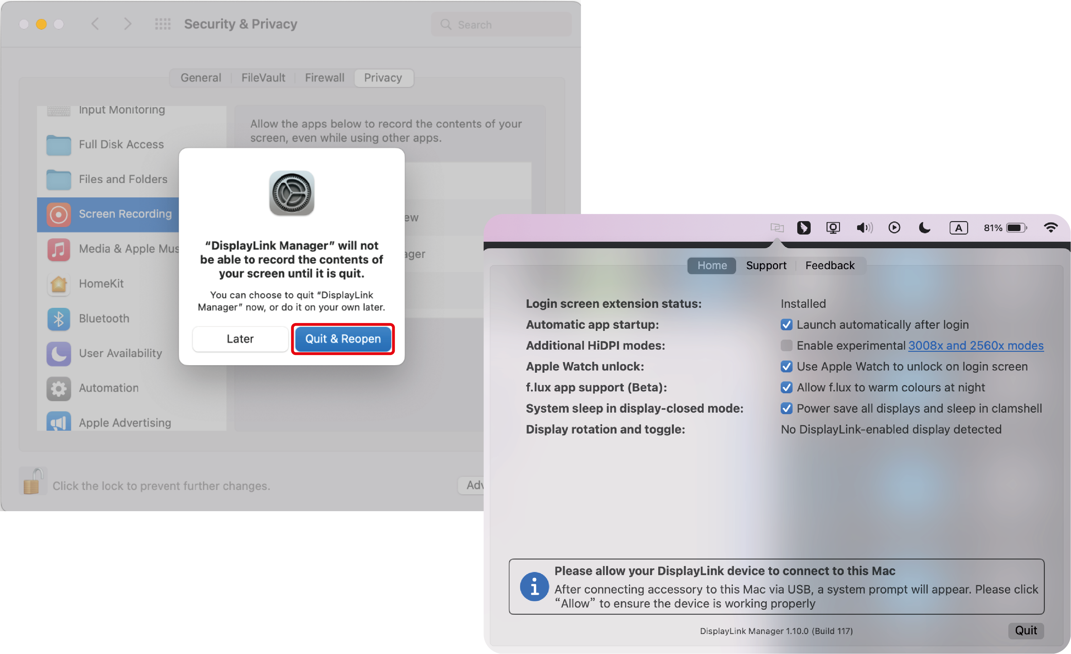 1. If you have enabled notifications from DisplayLink Manager, it will remind you to allow screen recording when it detects that this permission is missing.