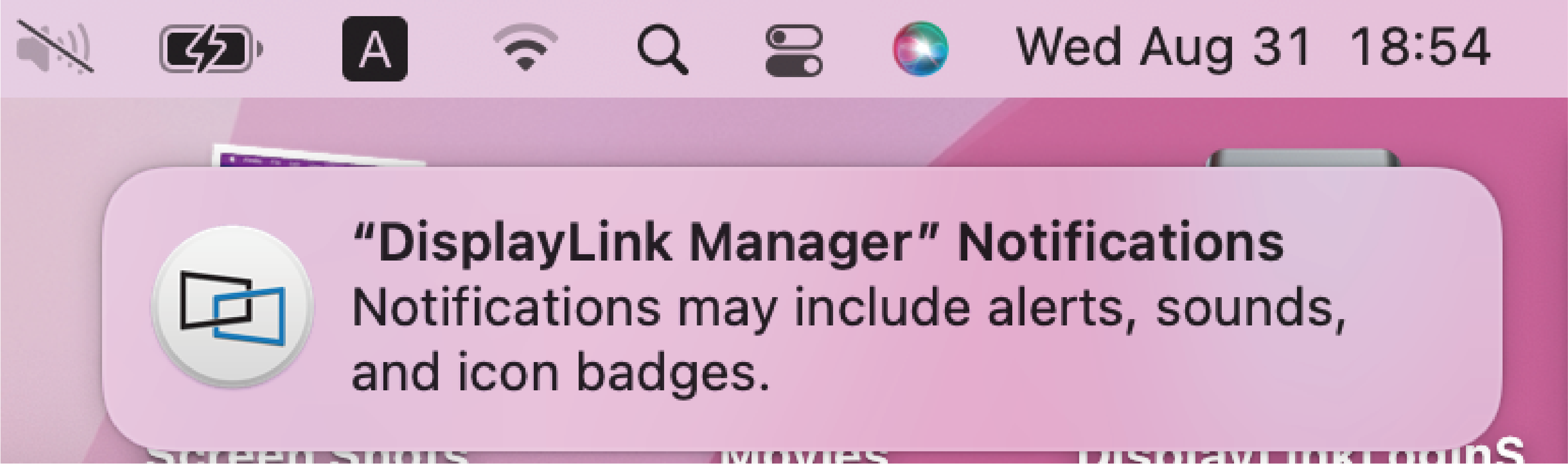 1. Click the DisplayLink Graphics icon in the funcion bar at the top right of the screen, and the notification will also appear in the DisplayLink Manager window. A warning is found here, you should allow the screen recording permission for DisplayLink Manager.