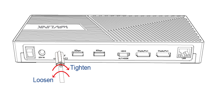 3). Fasten the bolt and fix the connectivity between the cable and the dock. Tighten the screw clockwise when you are assembling it. Please loosen the screw counter-clockwise if you need to disassemble it.
