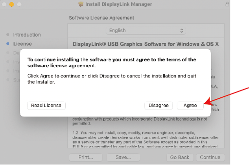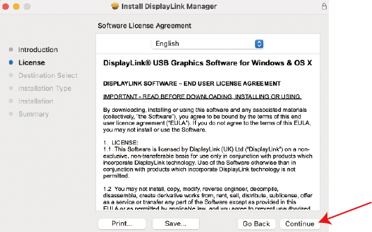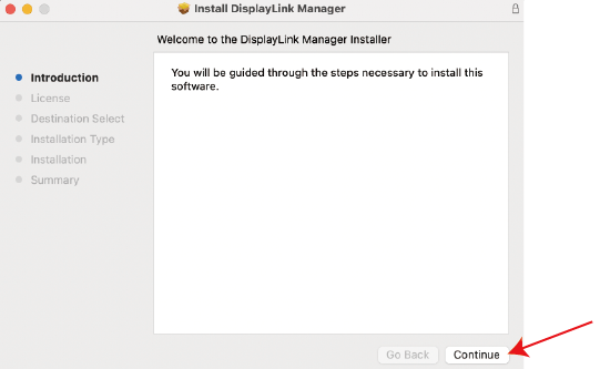 - Double-click the driver file you just downloaded, navigate to the Install DisplayLink Manager window, click Continue.