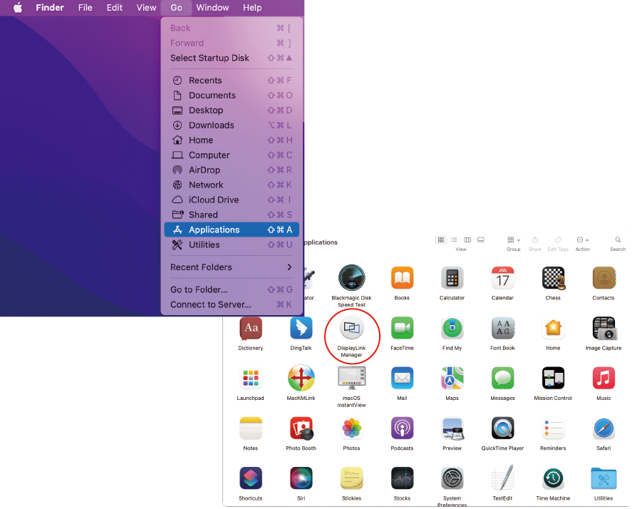 - If you didn't get the notification from DisplayLink Manager, please click Go in the function bar at the top left of screen, then select Applications and click DisplayLink Manager.