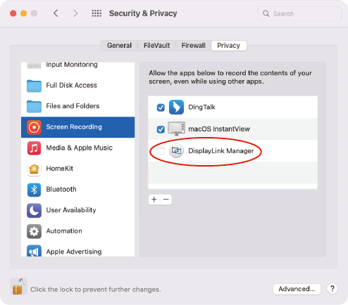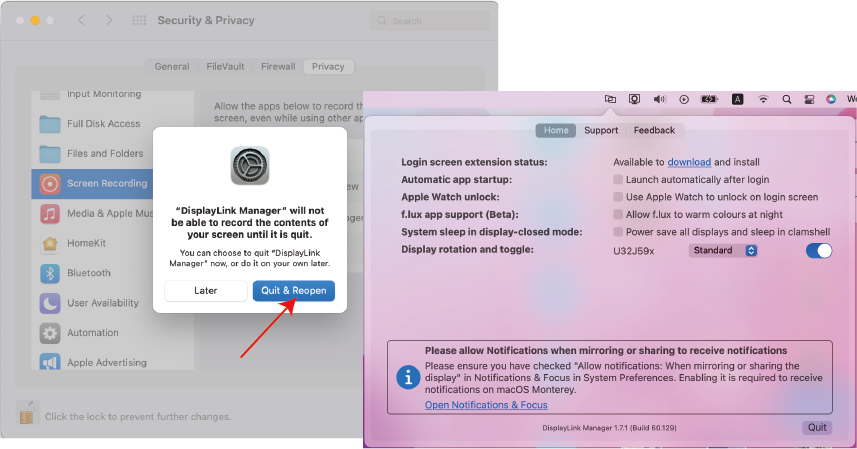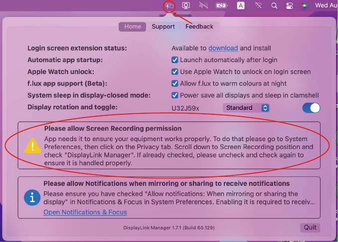 - If you have enabled notifications from DisplayLink Manager, it will remind you to allow screen recording when it detects that this permission is missing.