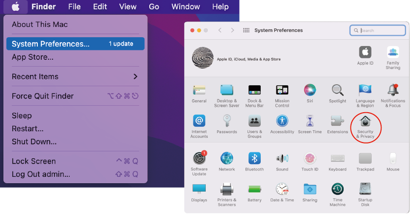 - Click the Apple icon and select System Preferences, then double click Security & Privacy.