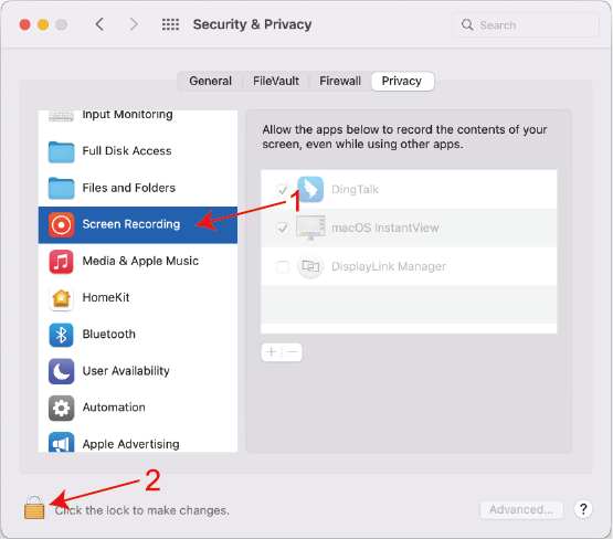 - Enable Screen Recording to allow the DisplayLink Manager application to capture pixels and send them to your USB peripheral: