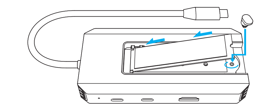 - Insert the SSD into the slot at a 45-degree angle, then press it down until it lies flat. Secure it in place using the black silicone buckle.