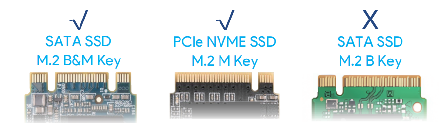 - Attention: To ensure smooth and successful operation of the SSD, we recommend choosing the appropriate SSD sizes: 2230/2242/2260/2280 and applicable interfaces: M and B+M key.