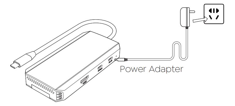 - Connect an external Power Adapter(100W) to the USB-C PD IN port, and plug the Power Adapter into the Power Outlet.