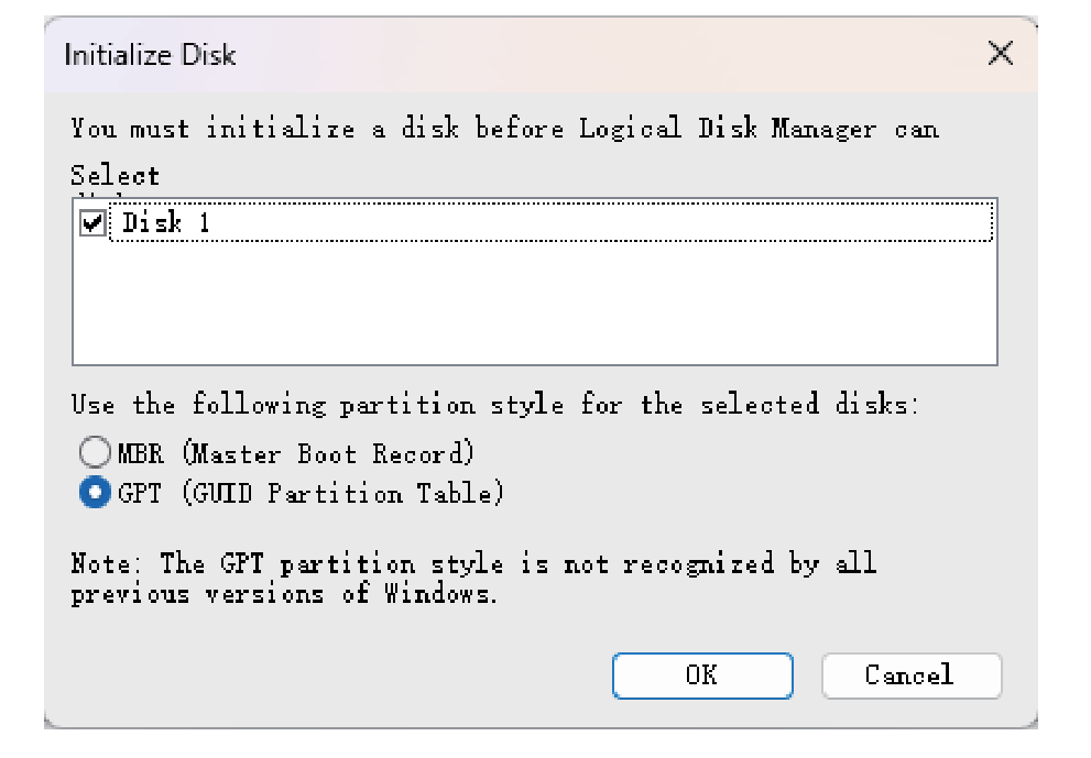 (1) Right click This PC icon and select “Manage”, choose “Storage” then go to “Disk Management”, select “MBR(Master Boot Record)” or “GPT(GUlD Partition Table)”, click “OK”.