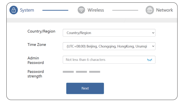 - 3.2. After logging in, select Country/Region and Time Zone, create a New Login Password. Click Next to continue.