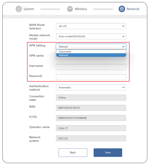 Solution: Set the APN manually Please select Manual to manually enter APN Settings, including APN name,User name, Password, and Authorization information.