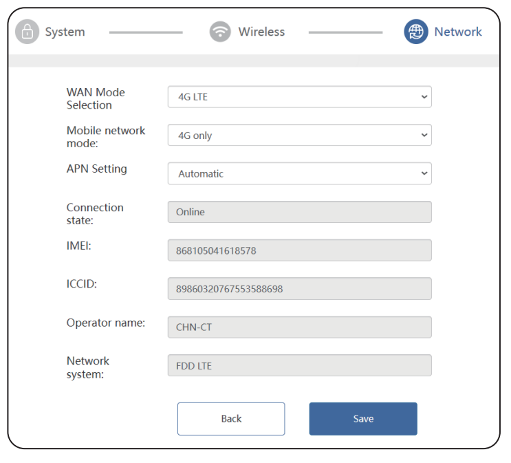 - 3.4 At the Network page, choose 4G LTE for WAN Mode Selection, the system automatically identifies and displays the SIM card information.
