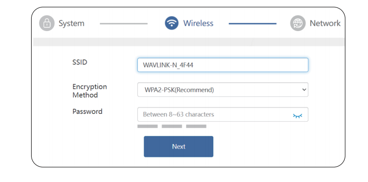 - 3.3 Customize the Wi-Fi SSID, Encryption Method and Password. Click Next to continue.