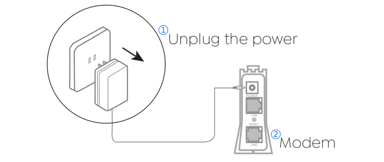 ① Unplug the power ② Modem