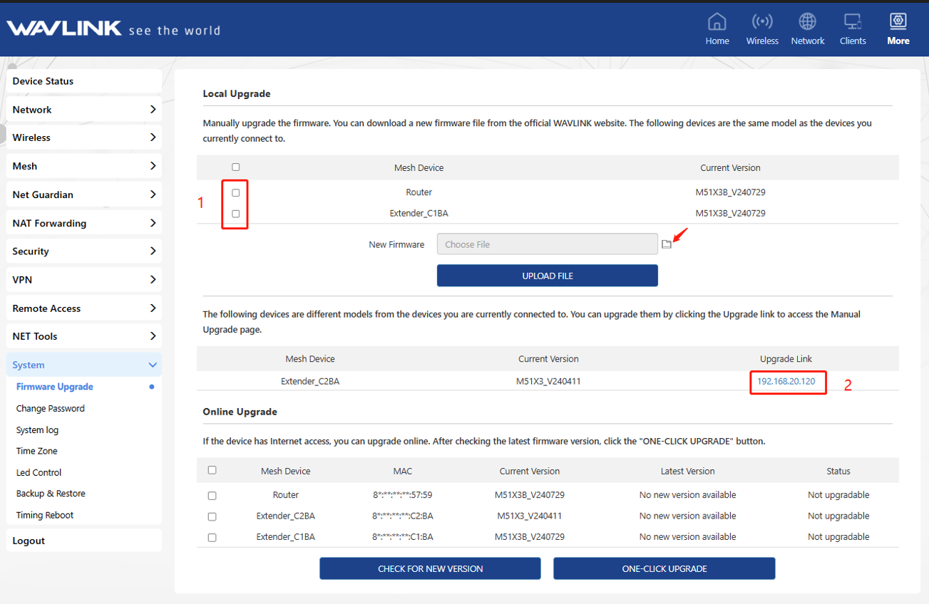 If your all mesh devices are same model, you can check and upgrade your deviecs together at ①. lf the model of your devices are not same, please visit the web interface of each device and upgrade it in ②.