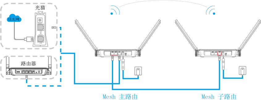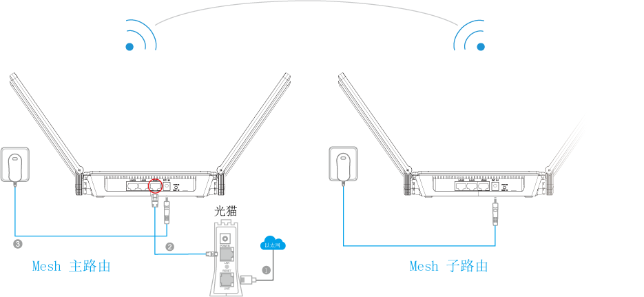 - Mesh主路由与Mesh子路由配对后,将Mesh子路由的WAN口连接到Mesh主路由的LAN口。